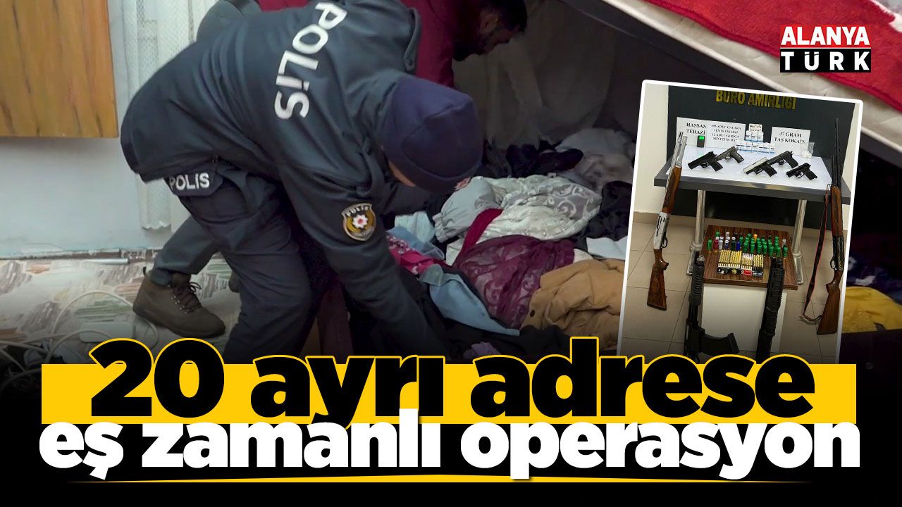 İl Emniyet Müdürlüğüne bağlı ekipler, Kepez ilçesinde 20 ayrı adrese yönelik 40 ekip, 150 personelin katılımıyla eş zamanlı operasyon düzenledi. Operasyon kapsamında yapılan aramalarda, 5 adet ruhsatsız tabanca, 4 adet ruhsatsız pompalı tüfek, 166 adet tabanca fişeği, 43 adet tüfek kartuşu, 505 adet sentetik uyuşturucu hap, 37 gram taş kokain ve 1 adet hassas terazi ele geçirildi.