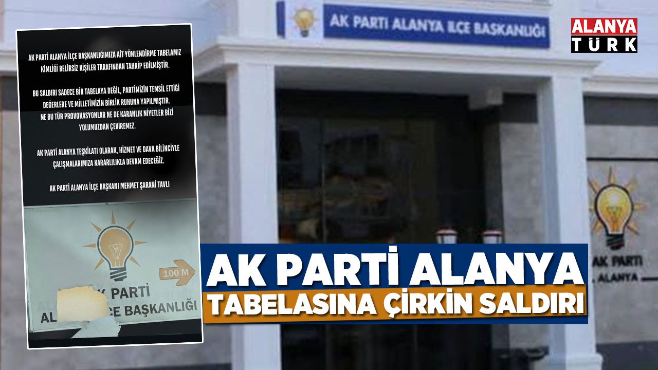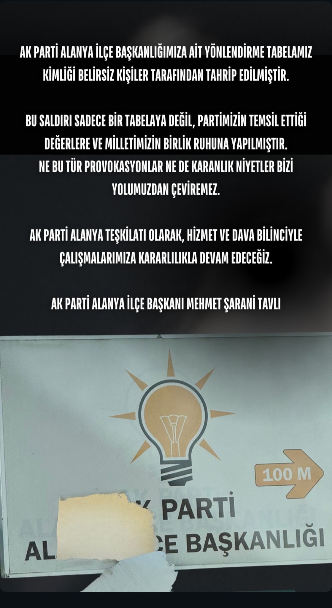 Saldırının ardından açıklama yapan AK Parti Alanya İlçe Başkanı Mehmet Şarani Tavlı, “Bu saldırı tabelaya değil, partimizin temsil ettiği değerlere ve milletimizin birlik ruhuna yapılmıştır. Ne bu tür provokasyonlar ne de karanlık zihniyetler bizi yolumuzdan çeviremez. Ak Parti Alanya teşkilatı olarak hizmet ve dava bilinciyle çalışmalarımıza kararlılıkla devam edeceğiz” dedi.