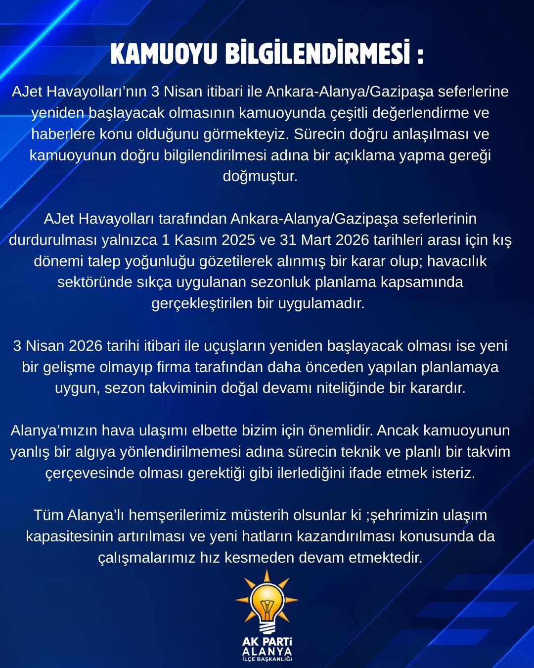 AJet Havayolları tarafından Ankara-Alanya/Gazipaşa seferlerinin durdurulması yalnızca 1 Kasım 2025 ve 31 Mart 2026 tarihleri arası için kış dönemi talep yoğunluğu gözetilerek alınmış bir karar olup; havacılık sektöründe sıkça uygulanan sezonluk planlama kapsamında gerçekleştirilen bir uygulamadır.