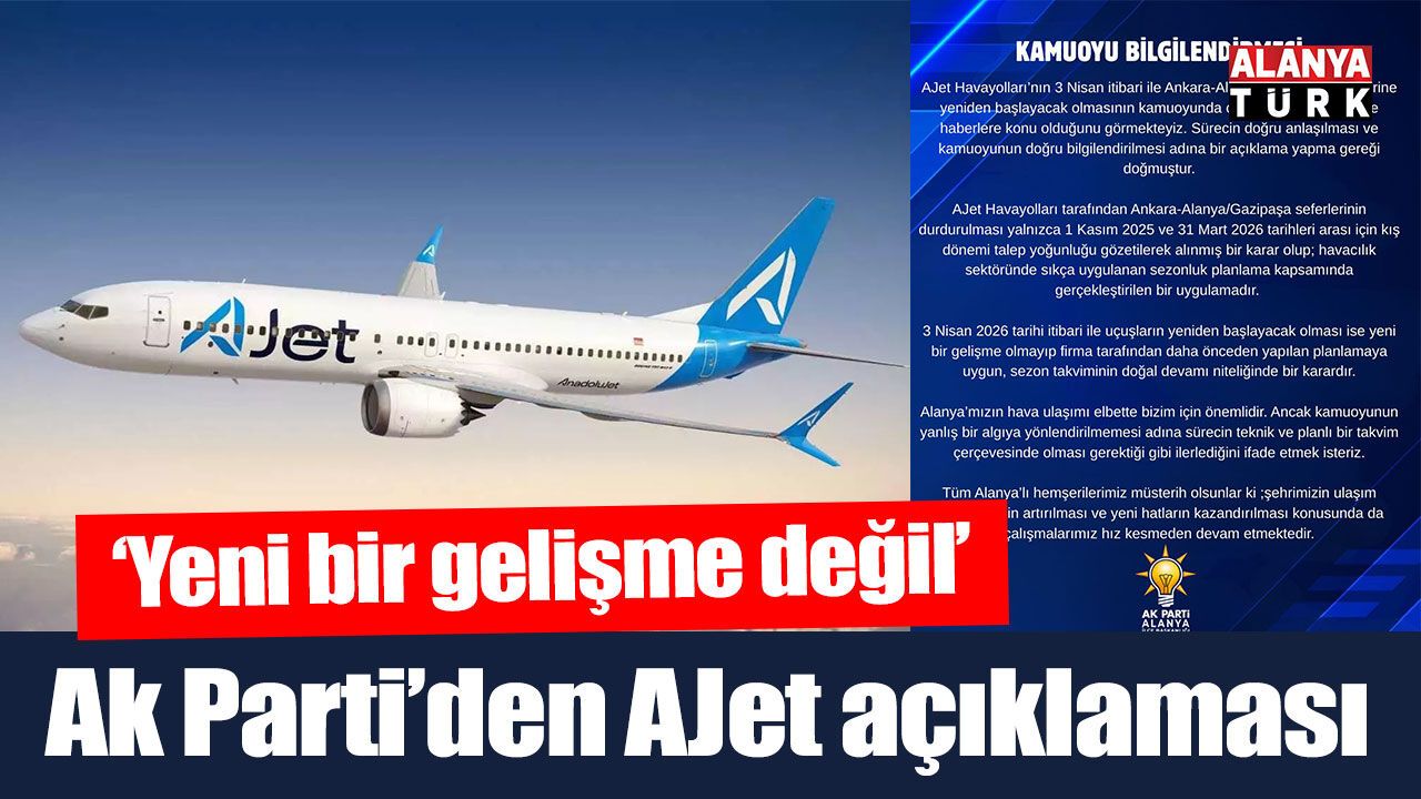 AJet Havayolları’nın 3 Nisan itibari ile Ankara-Alanya/Gazipaşa seferlerine yeniden başlayacak olmasının kamuoyunda çeşitli değerlendirme ve haberlere konu olduğunu görmekteyiz. Sürecin doğru anlaşılması ve kamuoyunun doğru bilgilendirilmesi adına bir açıklama yapma gereği doğmuştur.