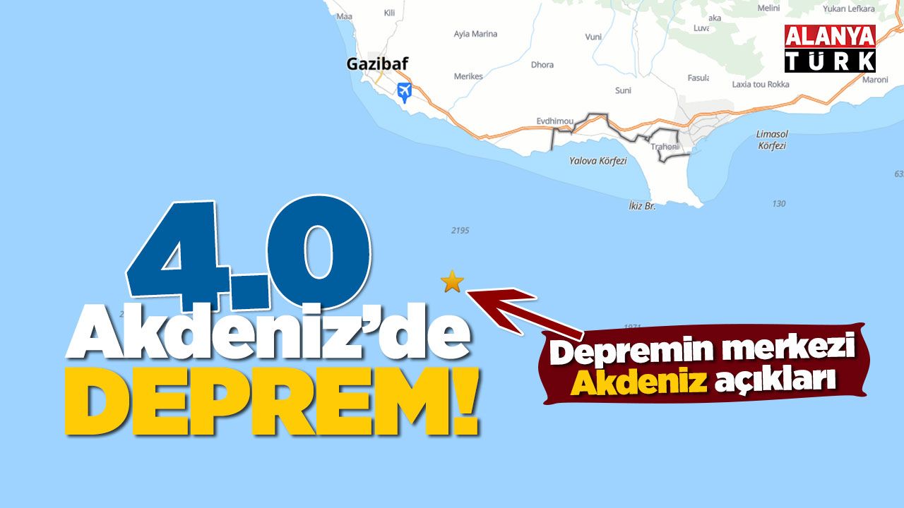 Afet ve Acil Durum Yönetim Başkanlığı (AFAD) tarafından yapılan açıklamaya göre, dün akşam saatlerinde Akdeniz açıklarında deprem meydana geldi. Açıklamada, depremin 4 büyüklüğünde olduğu belirtilirken, kıyıya olan uzaklığı ise 14 kilometre olarak belirlendi. Depreme en yakın bölgeler ise Karaman, Mersin, Antalya, Adana ve Hatay olarak kayıtlara geçti.