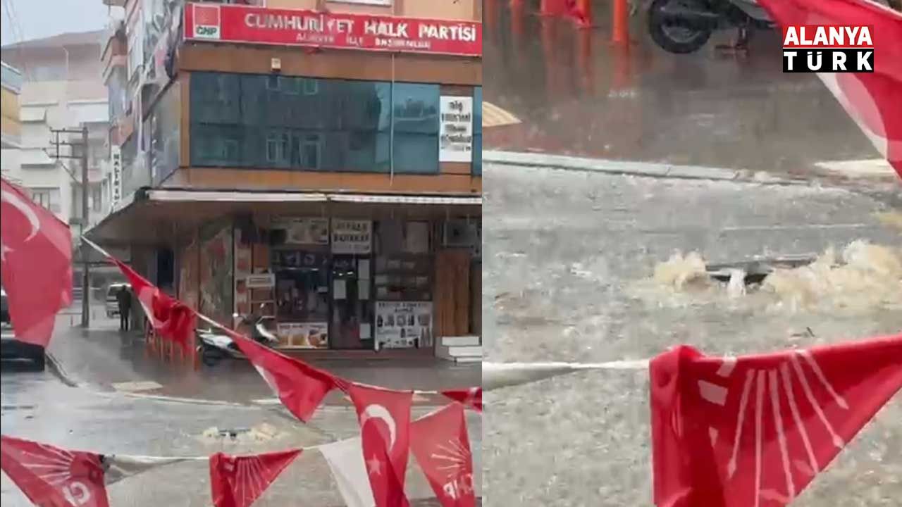 Alanya'da son iki gündür aralıklarla etkili olan şiddetli sağanak yağışlar, şehir genelinde hayatı olumsuz etkilerken, bazı noktalarda su baskınları ve altyapı sorunları yaşanmasına neden oldu. Özellikle yağışların yoğunlaştığı anlarda, Cumhuriyet Halk Partisi (CHP) Alanya İlçe Teşkilatı binasının hemen önünde bulunan bir rögar taştı. Taşan rögar nedeniyle bina önündeki yolun bir kısmı kısa sürede suyla kaplandı.