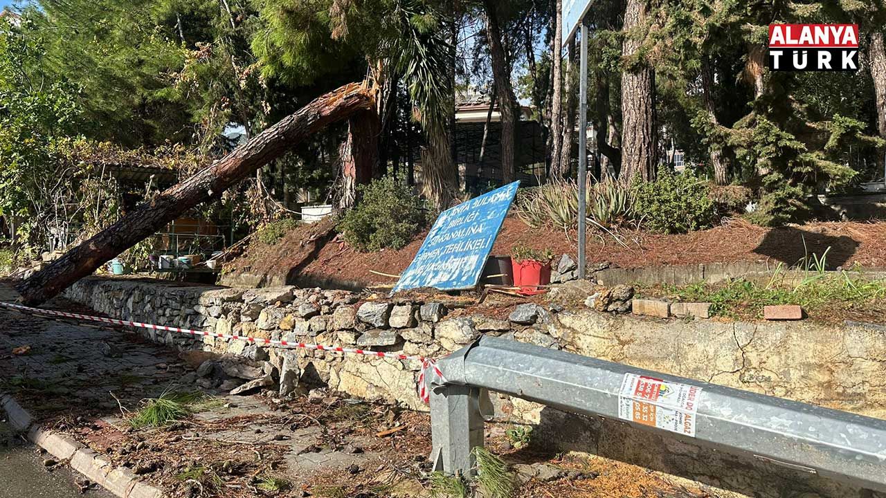 Alanya’da dün akşam saatlerinden itibaren etkili olan yağış ve şiddetli rüzgar Oba Sekilioğlu Mezarlığı içerisinde bulunan ağaç ile aynı mezarlığın önündeki kaldırımda yer alan aydınlatma direğinin devrilmesine neden oldu.