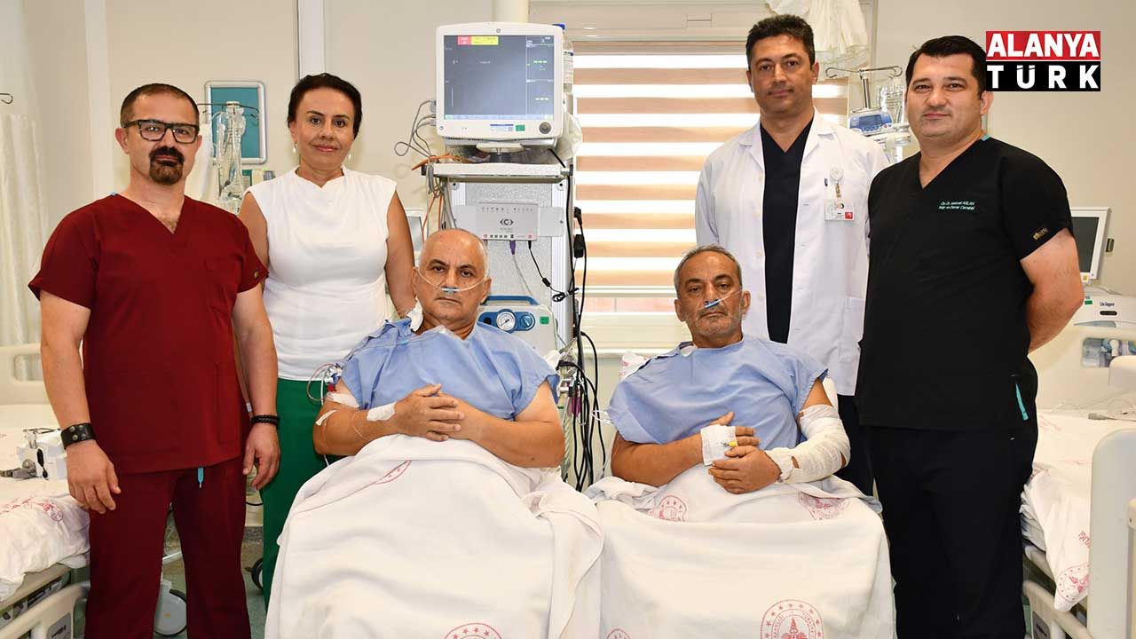 Alanya’da yaşayan 58 yaşındaki, iki çocuk babası Cemallettin Kıvanç, bir süre önce araba kullanırken yaşadığı kolda uyuşma ve nefes darlığı şikâyeti üzerine özel bir hastaneye başvurdu. Burada kalp krizi geçirdiği belirlenen Kıvanç, Alanya Eğitim ve Araştırma Hastanesi (EAH) Kalp Damar Cerrahisi Kliniği’ne sevk edildi. Alanya EAH’ta ilk müdahalesi yapılan hastanın kalp krizi geçirdiğini öğrenen 51 yaşındaki kardeşi Fahrettin Kıvanç, aynı hastaneye göğüs ağrısı şikâyetiyle başvurdu. Yapılan tetkikler sonucu Fahrettin Kıvanç’ın da kalp krizi geçirdiği tespit edildi. Anjiyo işlemleri yapılan Cemallettin Kıvanç’ın iki, Fahrettin Kıvanç’ın da beş damarının tıkalı olduğu belirlendi. Hastanede görevli Alanya Alaaddin Keykubat Üniversitesi (ALKÜ) Tıp Fakültesi Kalp ve Damar Cerrahisi Anabilim Dalı’ndan Dr. Öğr. Üyesi Özgür Akkaya, iki kardeşe yapılan kontrollerde kalbi besleyen koroner damarlarda ciddi tıkanıklık tespit edilince acil bypass ameliyatı önerdi ve hastaların onayının ardından operasyonları gerçekleştirdi. Aynı gün kalp krizi geçiren Kıvanç kardeşler, aynı gün yapılan bypass ameliyatı sonrası sağlığına kavuştu. Yoğun bakımda takip edilen kardeşler daha sonra servise alındı. Başarılı geçen ameliyatların ardından hastaların ilk ziyaretçisi ise hekimleri Dr. Öğr. Üyesi Özgür Akkaya oldu.