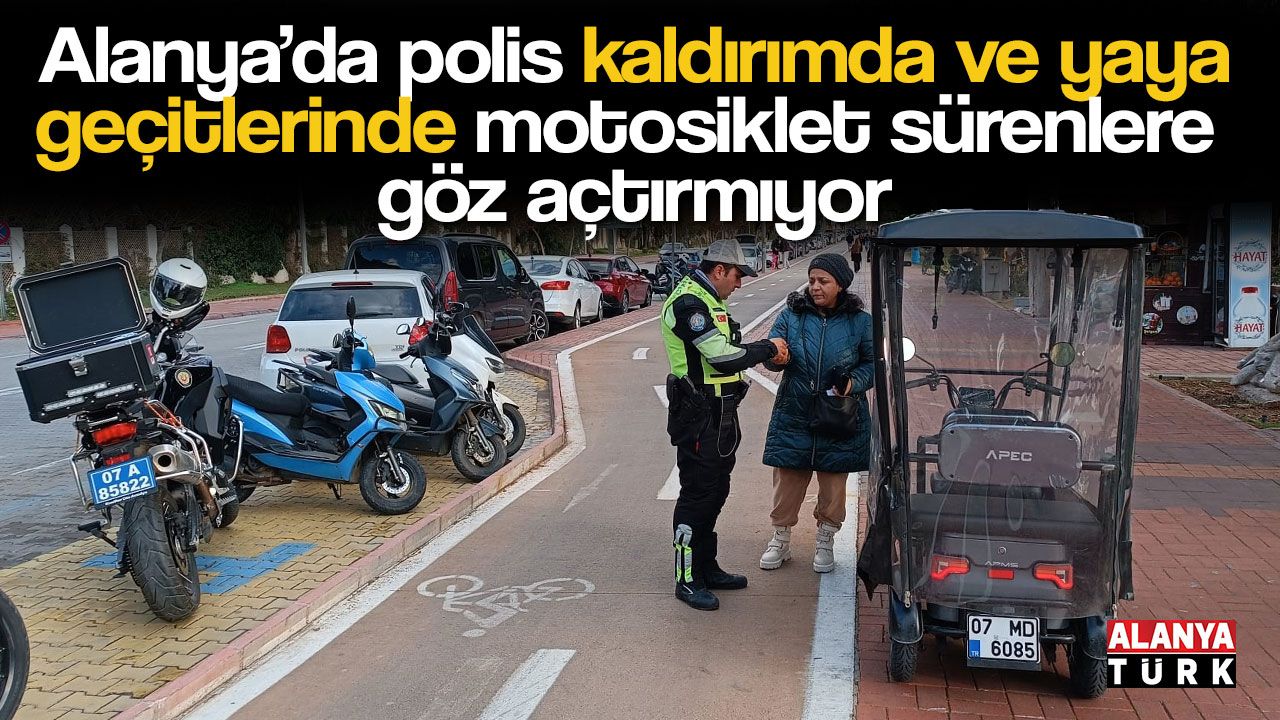 Alanya İlçe Emniyet Müdürlüğü Trafik ekipleri, ilçenin muhtelif noktalarında motosiklet ve elektrikli scooter sürücülerine yönelik denetim yaptı. Denetimlerde yasak olmasına rağmen kaldırımda ilerleyen ve yaya geçitlerini kullanan motosiklet sürücüleri tek tek durdurularak ceza yazıldı. Ayrıca bisiklet yolunu kullanmak yerine kaldırımda giden elektrikli scooter sürücülerine de cezai işlem uygulandı.