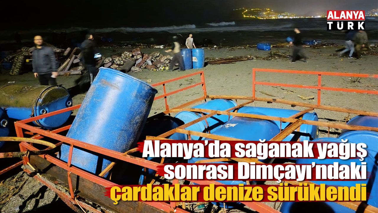 Alanya’daki etkili olan sağanak yağışın ardından su seviyesinin yükselmesi sonucu Dimçayı bölgesindeki bazı piknik işletmelerinde maddi zarar meydana geldi. Su seviyesinin yükselmesi sonucu bölgedeki çardaklar akıntıya kapılarak denize ulaştı. Çardaklarının akıntıyla denize ulaştığını öğrenen işletme sahipleri gece saatlerinde bölgeye kamyon ve kamyonetleri ile giderek denize ulaşan çardak, varil ve çeşitli eşyaları tek tek toplayarak kumsalda biriktirdi. İşletme sahipleri ve yakınları tarafından toplanan malzemeler ardından taşınarak kamyon ve kamyonetlere yüklendi.