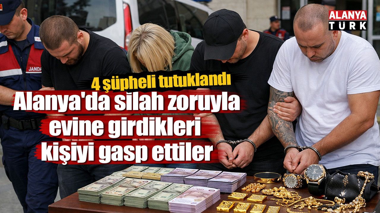 Olay Mahmutlar Mahallesi’nde meydana geldi. Yerleşik yaşayan Ukrayna uyruklu A.H'nin (46) evine silah zoruyla giren 4 kişi, 5 bin avro, 7 bin dolar, 200 gram altın, 10 bin dolar değerinde saat ve 18 bin avroluk kripto parayı başka bir hesaba aktararak kaçtı. A.H’nin durumu bildirmesi üzerine harekete geçen Alanya İlçe Jandarma Komutanlığı ekipleri, yaptıkları incelemenin ardından olayı gerçekleştirdiklerini tespit ettikleri Ukrayna uyruklu R.A. (38) ile Rus vatandaşı A.S. (31), S.U. (27) ve O.G'yi (34) gözaltına aldı. Şüphelilerin araçlarında yapılan aramada gasp ettikleri para ve değerli eşyaları ele geçirdi. Karakoldaki işlemlerinin ardından adliye sevk edilen şüpheliler sulh ceza hakimliğince tutuklanarak cezaevine gönderildi.