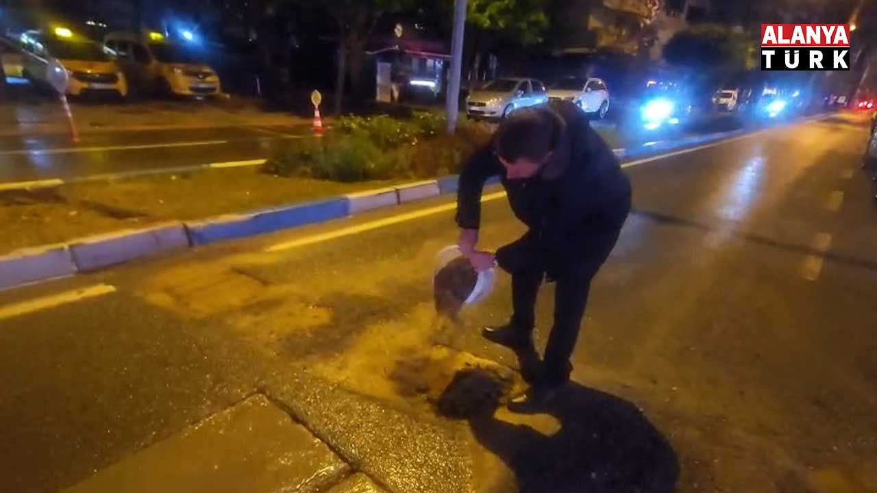 Alanya’nın Mahmutlar Mahallesi Caddesi, Barbaros Caddesi’nde yolun iki tarafında yapılan altyapı çalışması sonrasında tekrar asfaltlama yapılmaması sürücülere zor anlar yaşattı. Yolda düşenleri gören duyarlı bir esnaf olası kazaların önüne geçmek için duruma müdahale etti. Eline aldığı kovaya kum dolduran vatandaş yoldaki çukurları doldurarak önlem almaya çalıştı. Bölgedeki çukurları cep telefonu kamerası ile kaydeden bir vatandaş, “Sürücüler bu çukurlu yolları kullanıyor. Birileri öldükten sonra mı müdahale edecekler? Bunu da bilmiyorum. Bilenler çukura girmiyor. Bilmeyenler giriyor. Buraya acil müdahale lazım. Yazık, günah. Burada bir motosiklet sürücüsü çukura girse takla atar” diye konuştu.