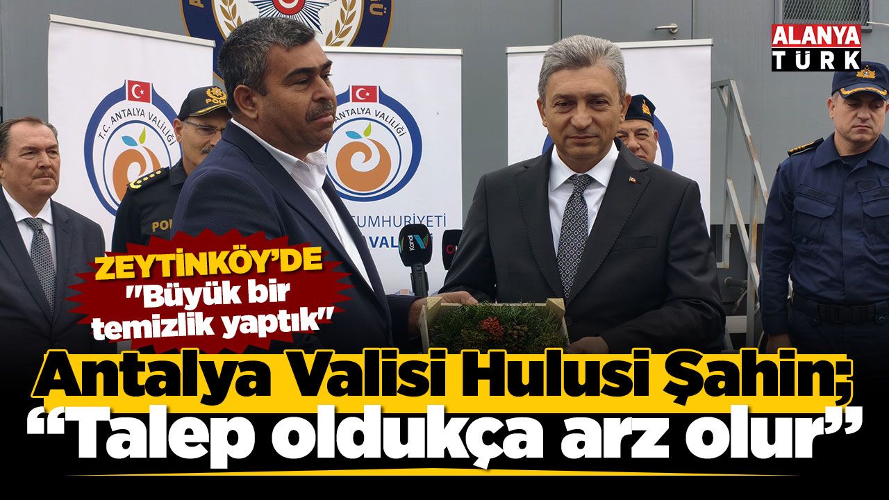 Kasım Ayı İl Asayiş ve Güvenlik Toplantısı Vali Hulusi Şahin başkanlığında Yeşildere (Zeytinköy) Mahallesindeki Antalya Emnriyet Müdürlüğü Mobil Karakol'da yapıldı. Toplantıda konuşan Vali Şahin, Zeytinköy bölgesinin zehir tacirlerinden temizlenmesi ile ilgili çalışmaların hız kesmeden sürdürüldüğünü belirterek, "Talep olduğu müddetçe her zaman arz filizlenir. Siz biçersiniz, başka bir yerden tekrar peydahlanır. Buraya bir karakol, polis merkezi yapacağız. Zaten mobil aracımız burada sabit duruyor, bölgede her zaman ekiplerimiz var. Burada polis hep olacak. Kentsel dönüşüm ile alakalı işler yapılması lazım. Burada imar faaliyetleri gerekiyor. Bu konuda paydaş kurumlarımızla çalışıyoruz ve tüm binaların yıkılması lazım. Çalışmalarımız devam ediyor. Kolay bir şey değil, imar problemleri var. Mülkiyet sorunları var. Parçalı bir mülkiyet yapısı var. Tebligat yapılması kolay değil. Bunlar zaman alan işler" dedi.