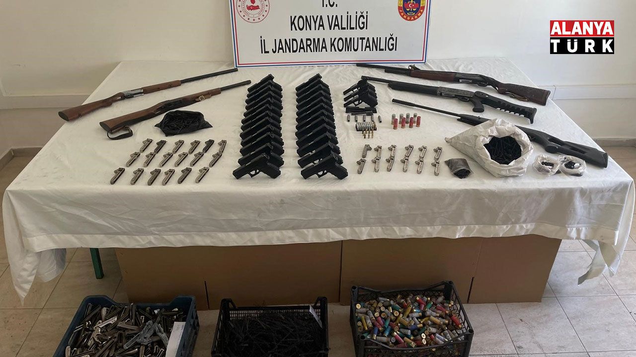 Antalya'nın Manavgat ve Konya'nın Beyşehir ilçelerinde silah kaçakçılığı yapıldığı ihbarı üzerine Cumhuriyet Başsavcılığı tarafından soruşturma başlatıldı. Soruşturma çerçevesinde İl Jandarma Komutanlığı Kaçakçılık ve Organize Suçlarla Mücadele Şube Müdürlüğü ekipleri tarafından yapılan araştırma sonucunda Mehmet E., Kadir T., Raşit B., Ali Han Ö. ve İbrahim Ö.'nün Antalya'nın Manavgat ilçesi ve Konya'nın Beyşehir ilçesinde bulunan işyeri, ev ve ikamet eklentilerinde yapılan arama sonucunda; 49 markasız ruhsatsız tabanca gövdesi, 49 markasız ruhsatsız tabanca üst kapağı, 49 markasız ruhsatsız tabanca namlusu, 49 markasız ruhsatsız tabanca yerine getiren yay ve mili, 24 ruhsatsız, seri numarasız 9 mm. tabanca, 3 seri numaralı, markalı, ruhsatsız av tüfeği, 1 seri numarasız, markasız av tüfeği, 1 markasız 5.5 mm havalı tüfek, 54 tane 9 mm tabanca fişeği, 5 tane 7.65 mm tabanca fişeği, 28 tabanca şarjörü, bin 681 av tüfeği fişeği, 5 bin 756 muhtelif tabanca parçası, 1 cep telefonu ile 1 tablet ele geçirildi. Jandarmadaki işlemlerinin ardından savcılığa sevk edilen 5 şüpheli şahıs çıkarıldıkları sulh ceza hakimi tarafından tutuklandı.