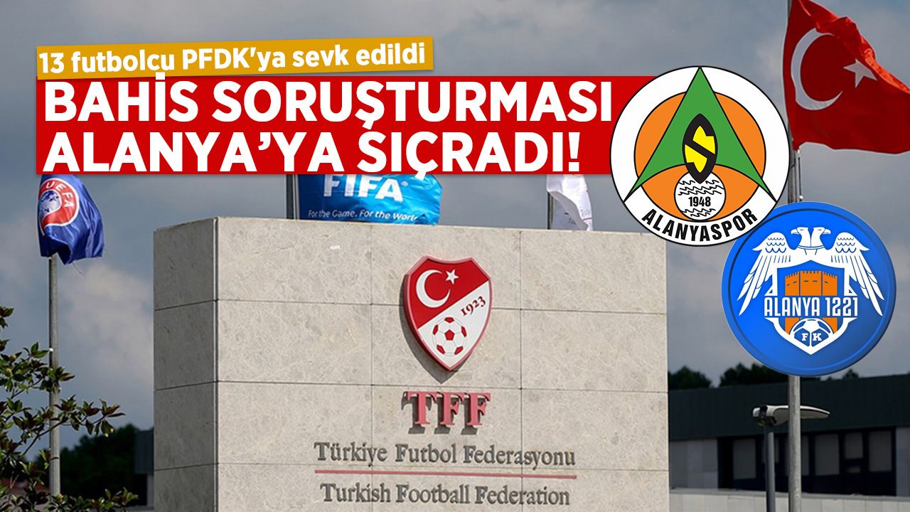 Türkiye Futbol Federasyonu (TFF) bahis soruşturması kapsamında bahis oynadığı iddia edilen futbolcuları resmi sitesinden duyurdu. Profesyonel Futbol Disiplin Kurulu'na (PFDK) sevk edilen bin 24 futbolcu arasında Corendon Alanyaspor'dan 4, Alanya 1221 FK'dan ise 9 futbolcu yer aldı.