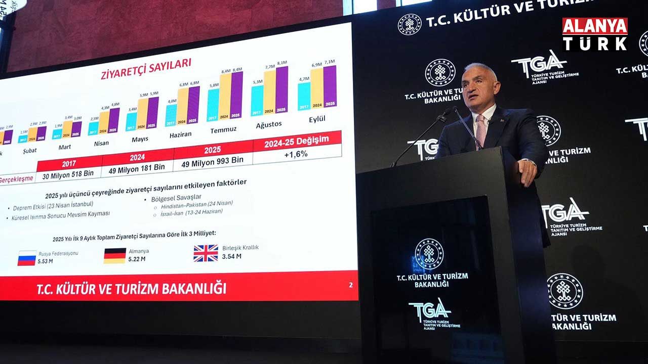 Kültür ve Turizm Bakanı Mehmet Nuri Ersoy, 2025 yılının ilk dokuz aylık verilerini değerlendirmek üzere İstanbul Atatürk Kültür Merkezi’nde (AKM) basın toplantısı düzenledi. Toplantıda konuşan Ersoy, turizmde başarı için yalnızca potansiyele sahip olmanın yeterli olmadığını belirterek, “Tarihiyle, kültürüyle, deniziyle ve güneşiyle güçlü bir potansiyele sahip olabilirsiniz. Ancak tek başına potansiyele sahip olmanın turizmde başarı için yeterli olmadığını görüyoruz. Eğer bu potansiyel doğru bir şekilde planlanmaz, etkili bir şekilde yönetilmez ve rasyonel bir tanıtım stratejisi geliştirilmezse, bu potansiyel hiçbir anlam ifade etmez” dedi.
