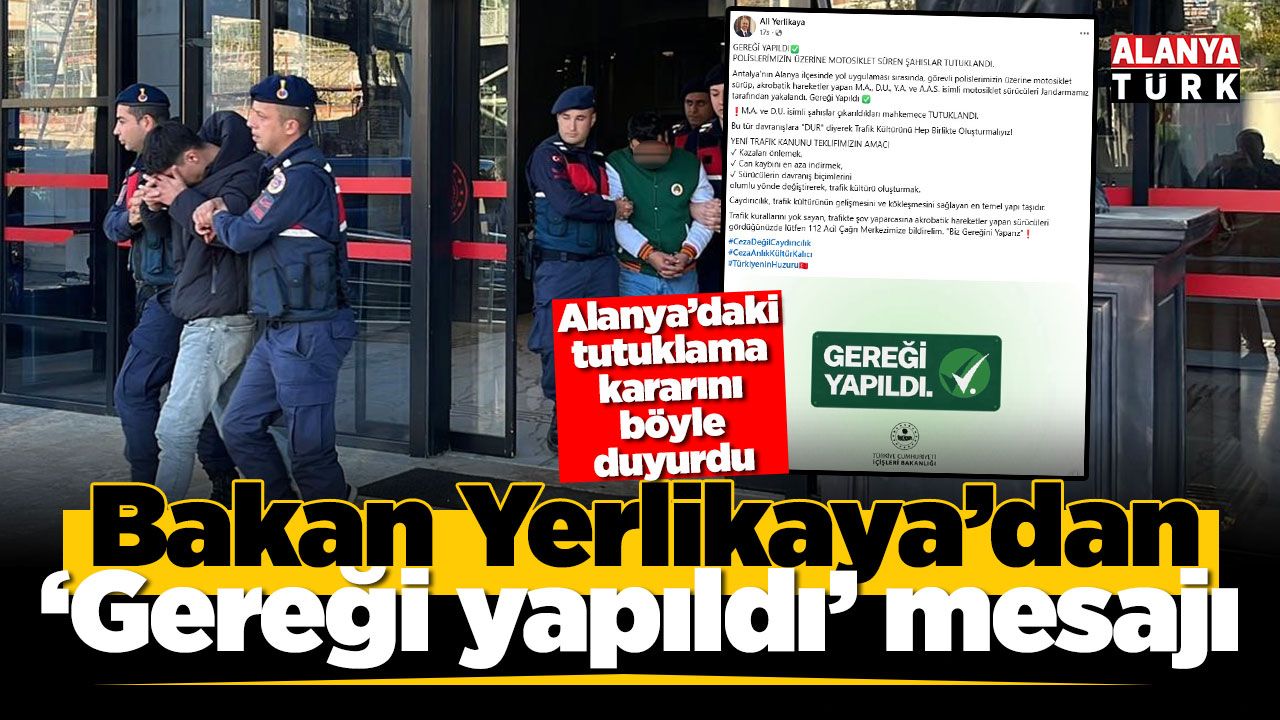 Alanya'da yol uygulaması yapan trafik polislerinin üzerine motosiklet sürerek tehlikeli hareketler yapan ve bu anları kendi sosyal medya hesaplarından paylaşan 4 şüpheliden 2'si, çıkarıldıkları mahkemece tutuklanarak cezaevine gönderilmişti. Konuyla ilgili sosyal medyadan paylaşım yapan İçişleri Bakanı Ali Yerlikaya, "Bu tür davranışlara "DUR" diyerek Trafik Kültürünü Hep Birlikte Oluşturmalıyız" dedi.
