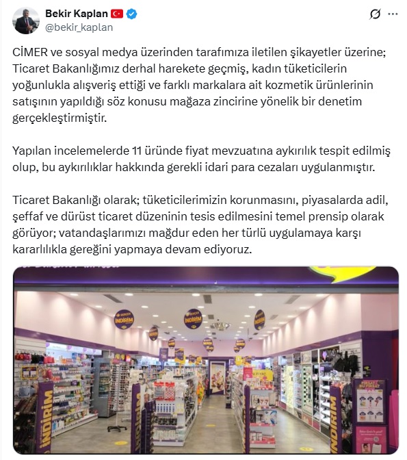 "CİMER ve sosyal medya üzerinden tarafımıza iletilen şikayetler üzerine; Ticaret Bakanlığımız derhal harekete geçmiş, kadın tüketicilerin yoğunlukla alışveriş ettiği ve farklı markalara ait kozmetik ürünlerinin satışının yapıldığı söz konusu mağaza zincirine yönelik bir denetim gerçekleştirmiştir. Yapılan incelemelerde 11 üründe fiyat mevzuatına aykırılık tespit edilmiş olup, bu aykırılıklar hakkında gerekli idari para cezaları uygulanmıştır. Ticaret Bakanlığı olarak; tüketicilerimizin korunmasını, piyasalarda adil, şeffaf ve dürüst ticaret düzeninin tesis edilmesini temel prensip olarak görüyor; vatandaşlarımızı mağdur eden her türlü uygulamaya karşı kararlılıkla gereğini yapmaya devam ediyoruz."