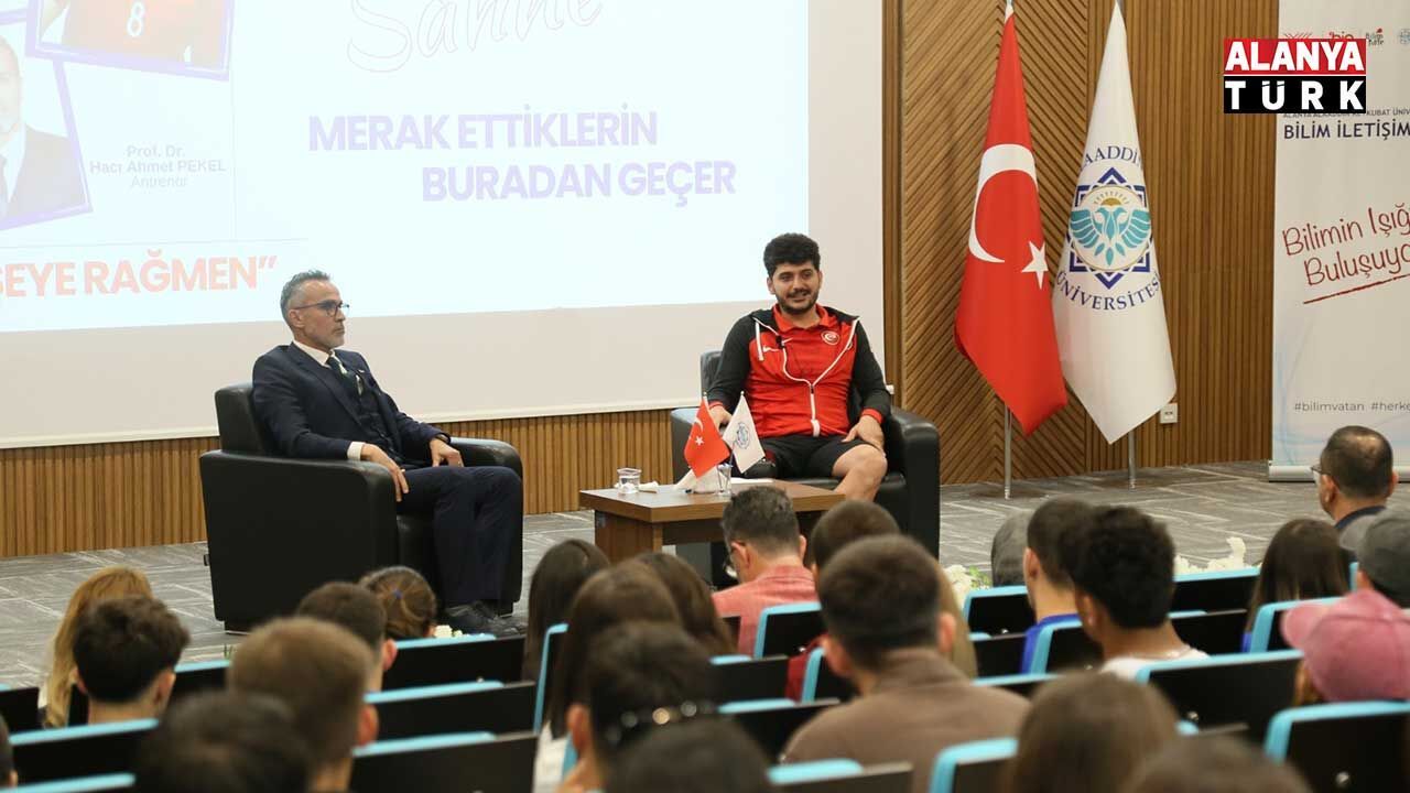 Alanya Alaaddin Keykubat Üniversitesi (ALKÜ) Bilim İletişimi Ofisi “Merak Ettiklerin Buradan Geçer” program serisinin üçüncüsü yapıldı. Serinin üçüncü bölümünde Türkiye'de ve dünyada “Ampute Messi” olarak tanınan milli sporcu Barış Telli ve Antrenörü Prof. Dr. Hacı Ahmet Pekel, “Her Şeye Rağmen” isimli düzenlenen konferansta Alanyalılarla buluştu. Öğrencilerin ve vatandaşların yoğun katılım gösterdiği programda Telli, çocukluğunda geçirdiği trafik kazasından dünya şampiyonluklarına uzanan, “imkânsız” kelimesini hayatından sildiği ilham verici yolculuğunu paylaştı. ALKÜ Alev Alatlı Konferans Salonu’nda yapılan programa Rektör Yardımcısı Prof. Dr. Işık Bayraktar, Alanya Belediyesi Engelsiz Yaşam Merkezi Müdürü Münir Altıoğlu, Alanya Mevlüt Çavuşoğlu Spor Lisesi Müdürü Taner Yıldırım, akademisyenler, öğrenciler ve vatandaşlar katıldı.