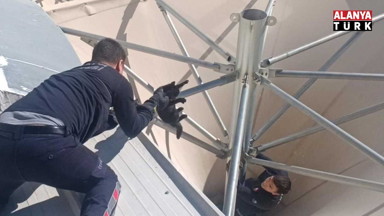 Manavgat'ta 112 Acil Çağrı Merkezi’ne gelen 'Pazartesi Pazarı çatısında kedinin mahsur kaldığı' ihbarı Antalya Büyükşehir Belediyesi itfaiyesi Manavgat birimine bağlı kurtarma ekibini harekete geçirdi. Kısa sürede verilen adrese gelen ekip, gerekli malzemeleri aldıktan sonra kedinin mahsur kaldığı bildirilen pazar yerinin huni şeklindeki çatısına çıktı. İtfaiye görevlileri daha önce de defalarca kedi kurtardıklarını belirttikleri çatıda ilk olarak kedinin bulunduğu yere ip atarak kediyi ipe yönlendirmek suretiyle kedinin kendiliğinde çıkmasını denedi. Kedi ipe yönelmeyince bu kez görevli elindeki eldivenle kediyi bulunduğu yerden alarak yukarıdaki arkadaşına verdi ve kediyi bulunduğu yerden kurtardı. Kurtarılan kedi herhangi bir sağlık sorunu olmaması üzerine doğaya salınırken, itfaiye görevlileri olay yerinden ayrıldı. – İHA