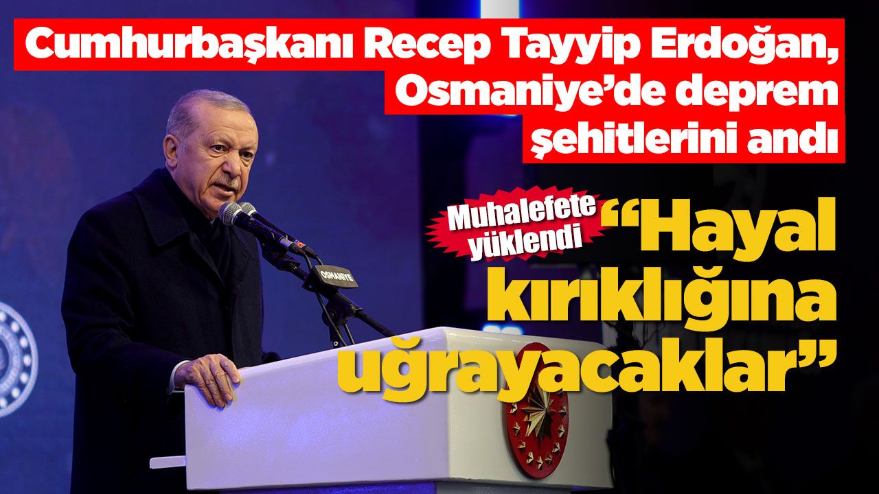 Ana muhalefet partisinin devletin yaptıklarını gölgelemeye çalıştığını anlatan Erdoğan, "Biz vatandaşlarımızın hayatını kurtarmaya çalışırken maalesef ana muhalefetin başını çektiği bazı çevreler de siyasi rant devşirmenin hesabını yapıyordu. Millet ve memleket hayrına ne kadar proje, eser, hizmet veya yatırım varsa hepsine çamur atmayı vazife sayan bu hazımsızlar; bu depremzedelerimizin acılarını menfaate çevirmeye, duygularını istismar etmeye çalıştılar. Deprem turistlerinin atmadıkları iftira kalmadı. Çıktılar, ‘devlet vatandaşını yalnız bıraktı’, ‘arama kurtarma faaliyetleri, yardım çalışmaları oy rengine göre yapılıyor’, ‘bu evleri bitiremez’ dediler. Kardeşlerim bunların bitmez dediği evler burada. Ne bir işin ucundan tuttular ne de ellerini taşın altına koydular. Maalesef böyle bir mesele bile ne yazık ki bunların gündemine gelmedi, burada da partizanca davrandılar. Sonuçta hepsinin hevesi kursaklarında kaldı. İktidarımızın ve ittifakımızın enkaz altında kalmasını bekleyenler büyük bir hayal kırıklığına uğradı. Allah’ın izniyle biz bu işin altından kalkarız dedik ve hemen işe koyulduk. 3 yıl gibi kısa sürede şehirlerimizi ihya ettik. Rakamlar ortada 433 bin 667’si konut 21 bin 690’ı iş yeri olmak üzere 455 bin 357 bağımsız bölümü tamamladık. Geçtiğimiz 27 Aralık’ta Hatay’ımızda 455 bininci konutun anahtarını teslim ettik" dedi.