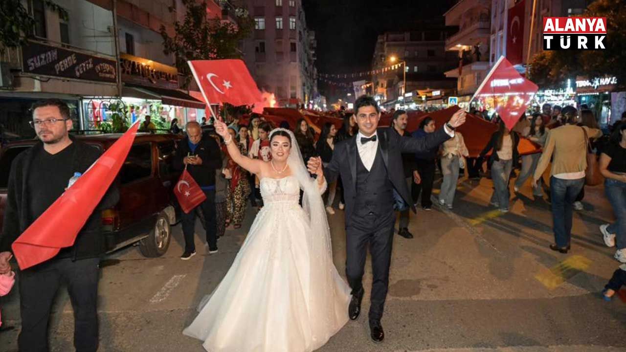 Demre'de önceki akşam Cumhuriyet'in 102. yıl dönümü kutlamaları çerçevesinde düzenlenen fener alayında sıradışı görüntüler yaşandı. Ellerinde bayraklar ve meşalelerle vatandaşlar, bayram coşkusunu Demre sokaklarına taşıdı. Düğünleri olan Gülsüm Görgülü ve Bayram Kıvrak çifti ise, gelinliği ve damatlığıyla Cumhuriyet coşkusunu paylaşmak için yürüyüşe katıldı. Vatandaşların ve izleyicilerin ilgisini çeken çift, Cumhuriyet Meydanı'ndan başlayıp Noel Baba Meydanı'nda son bulan kortej boyunca halkla birlikte yürüdü. Fener alayının ardından çift, düğün salonuna geçip nikahlarını kıydırdı. – İHA