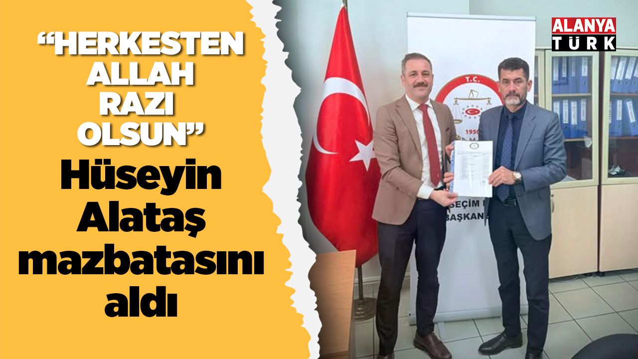 Alanya Mobilyacılar Doğramacılar ve Hızarcılar Odası’nın 30 Ocak’ta düzenlenen seçimli olağan genel kurulunda tekrar başkan seçilen Hüseyin Alataş, İlçe Seçim Kurulu’na giderek mazbatasını aldı. Mazbatasını almasının ardından açıklama yapan Alataş, “Mazbatamızı İlçe Seçim Kurulu’nda Mücahit Bey’den teslim aldık. Bu süreç boyunca bizleri yalnız bırakmayan tüm esnafımıza ve gönül dostlarıma teşekkür ediyorum. Katılan ve katılamayan herkesten Allah razı olsun” dedi.