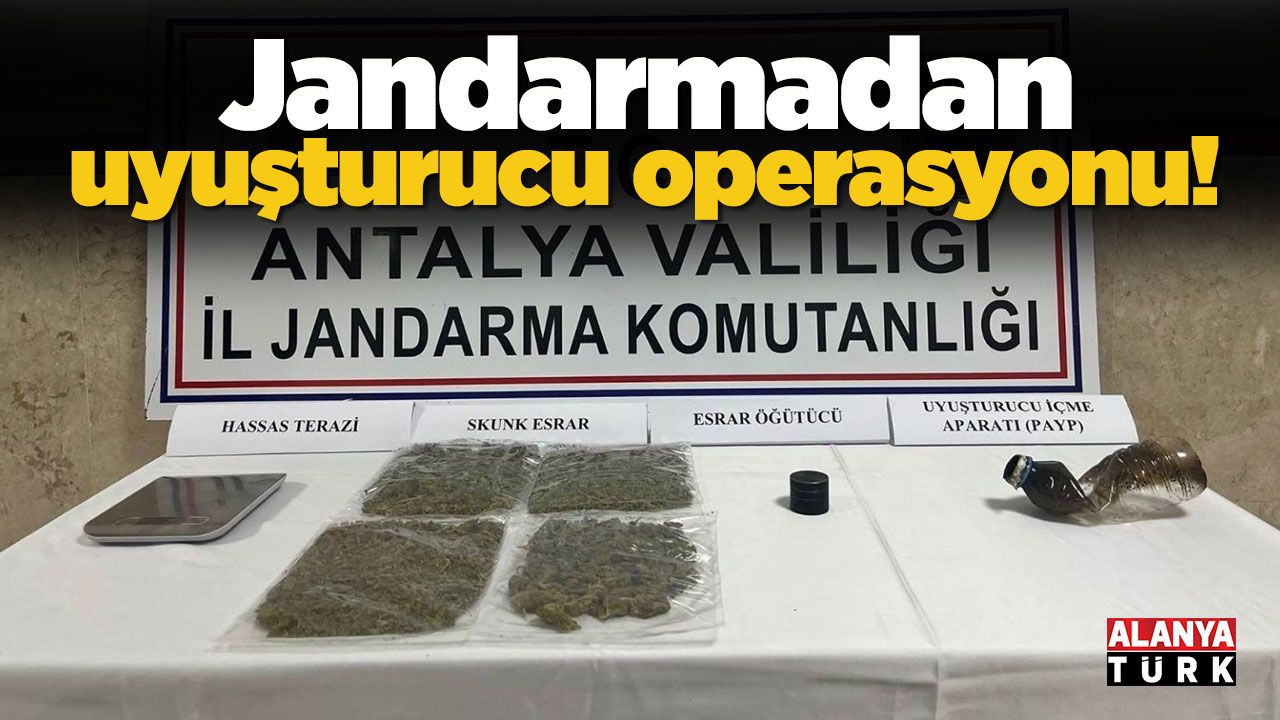 Manavgat Cumhuriyet Başsavcılığının talimatıyla Antalya İl Jandarma Komutanlığınca, uyuşturucuyla mücadele kapsamında çalışma yürütüldü. Bu kapsamda M.Z. isimli şüpheliye ait araçta ve ikamette yapılan aramalarda, 250 gram skunk, 1 adet hassas terazi, 1 adet uyuşturucu öğütme aparatı ve 1 adet uyuşturucu içme aparatı ele geçirildi.
