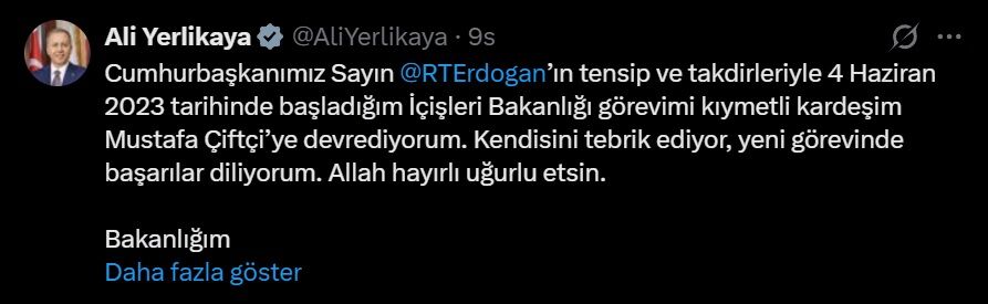 Ali Yerlikaya, sosyal medya hesabından yaptığı paylaşımda, "Cumhurbaşkanımız Sayın Recep Tayyip Erdoğan’ın tensip ve takdirleriyle 4 Haziran 2023 tarihinde başladığım İçişleri Bakanlığı görevimi kıymetli kardeşim Mustafa Çiftçi’ye devrediyorum. Kendisini tebrik ediyor, yeni görevinde başarılar diliyorum. Allah hayırlı uğurlu etsin. Bakanlığım süresince verdiği büyük desteklerinden dolayı Sayın Cumhurbaşkanımıza şükranlarımı arz ediyorum. Ülkemizin huzur ve güvenliği için canla başla görev yapan İçişleri Ailemizin her bir ferdine ayrı ayrı yürekten teşekkür ediyorum. Allah’a emanet olun" dedi.