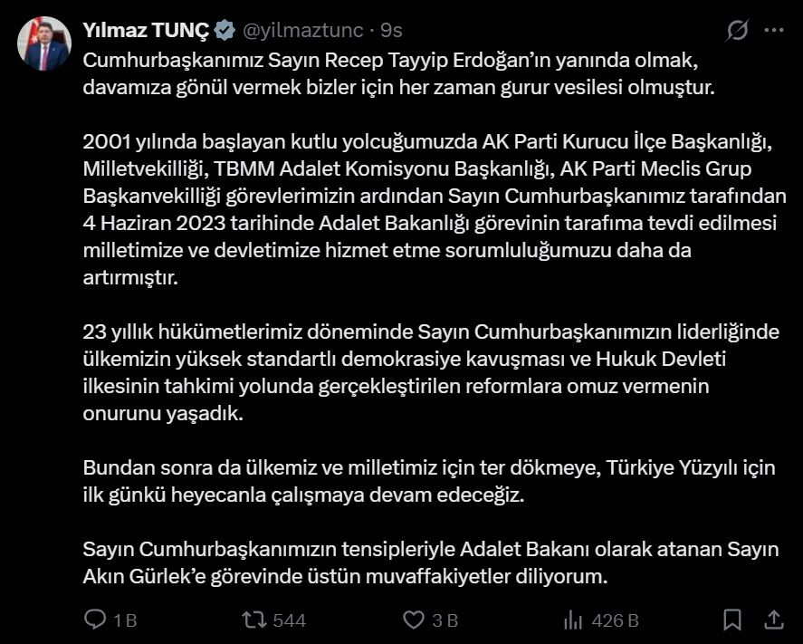Yılmaz Tunç, sosyal medyadan paylaşım yaparak, "Cumhurbaşkanımız Sayın Recep Tayyip Erdoğan’ın yanında olmak, davamıza gönül vermek bizler için her zaman gurur vesilesi olmuştur. 2001 yılında başlayan kutlu yolcuğumuzda AK Parti Kurucu İlçe Başkanlığı, Milletvekilliği, TBMM Adalet Komisyonu Başkanlığı, AK Parti Meclis Grup Başkanvekilliği görevlerimizin ardından Sayın Cumhurbaşkanımız tarafından 4 Haziran 2023 tarihinde Adalet Bakanlığı görevinin tarafıma tevdi edilmesi milletimize ve devletimize hizmet etme sorumluluğumuzu daha da artırmıştır. 23 yıllık hükümetlerimiz döneminde Sayın Cumhurbaşkanımızın liderliğinde ülkemizin yüksek standartlı demokrasiye kavuşması ve Hukuk Devleti ilkesinin tahkimi yolunda gerçekleştirilen reformlara omuz vermenin onurunu yaşadık. Bundan sonra da ülkemiz ve milletimiz için ter dökmeye, Türkiye Yüzyılı için ilk günkü heyecanla çalışmaya devam edeceğiz. Sayın Cumhurbaşkanımızın tensipleriyle Adalet Bakanı olarak atanan Sayın Akın Gürlek’e görevinde üstün muvaffakiyetler diliyorum." dedi.