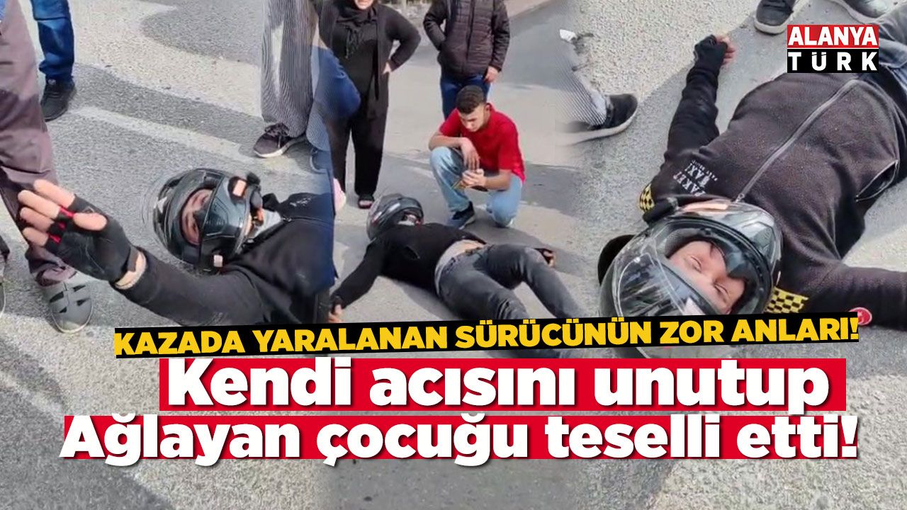 Kaza, Manavgat ilçesi Yayla Mahallesi Abdi İpekçi Caddesi'nde meydana geldi. Edinilen bilgiye göre, Barbaros Caddesi'nden gelip Remzi Güven Caddesi istikametine gitmekte olan Mümin Ş.'nin kullandığı 07 CFP 880 plakalı motosiklet, 2545. Sokak kesişimine geldiğinde Rümeysa A.'nın kullandığı 07 CBK 962 plakalı otomobille çarpıştı. Kazayı gören çevredeki vatandaşlar yaralı motosiklet sürücüsünün yardımına koşarken, durumun 112 Acil çağrı Merkezi'ne bildirilmesi üzerine olay yerine polis ve sağlık ekipleri sevk edildi. Bu sırada yerde acı içerisinde kıvranan motosiklet sürücüsü, çarpıştığı otomobilin sürücüsü ve küçük çocuğunun ağladığını fark edince kendi acını bir kenara bıraktı. Mümin Ş., "Ablam korkma. Ben iyiyim. Kolum bacağım ağrıyor sadece, çocuğa su içirin. Her şeyden önemlisi çocuk" diyerek durumunun iyi olduğunu, panik yapmamalarını istedi. O anlar cep telefonu kamerasına yansırken, Mümin Ş. sağlık ekiplerinin olay yerindeki ilk müdahalesinin ardından ambulansla hastaneye kaldırıldı.