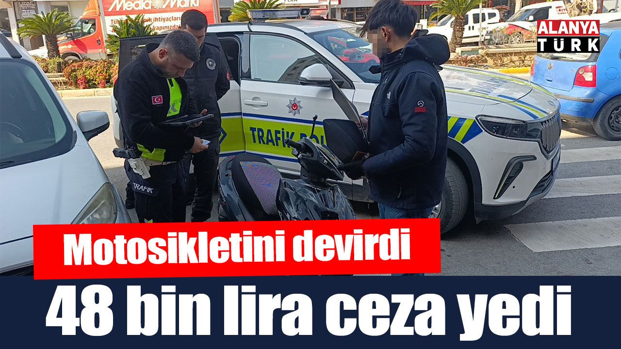 Kazayı gören çevredeki vatandaşlar durumu 112 Acil Çağrı Merkezi’ne bildirdi. İhbarın ardından olay yerine Manavgat Emniyet Müdürlüğü Trafik Denetleme Büro Amirliği ekipleri sevk edildi. Sağlık durumu iyi olan ve kazayı yara almadan atlatan sürücü Mustafa Ö., trafik polislerinin denetimine takıldı. Trafik ekiplerince yapılan kontrollerde; motosikletin plakasının takılı olmadığı, sürücünün ise sürücü belgesinde 100 ceza puanını doldurduğu tespit edildi. Sürücüye, plakasız araç kullanmaktan 46 bin TL ve sürücü belgesini yanında bulundurmamaktan 2 bin 719 TL olmak üzere toplamda 48 bin 719 TL idari para cezası uygulandı.
