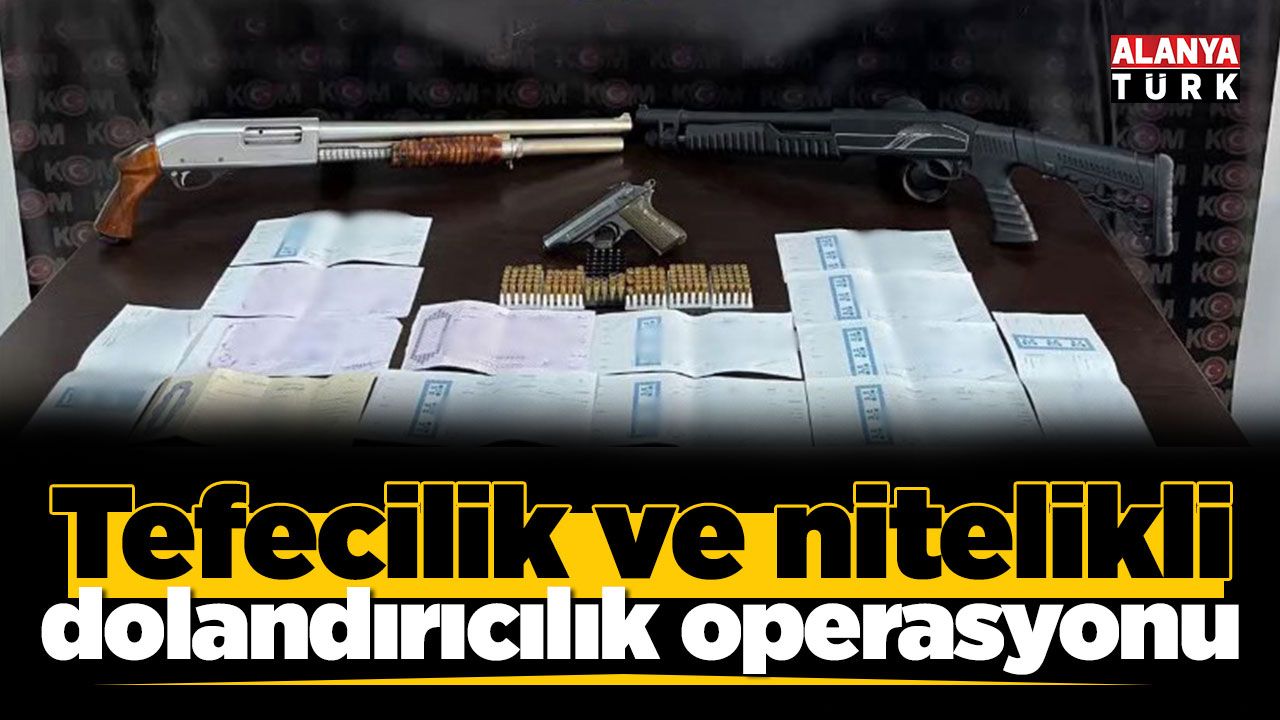 Kaçakçılık ve Organize Suçlarla Mücadele Başkanlığı koordinesinde, Antalya'nın da aralarında bulunduğu 3 ilde yapılan eş zamanlı operasyon yapıldı. Operasyonda tefecilik suçundan 4 olayda 19 şüpheli şahıs ile nitelikli dolandırıcılık suçundan 1 olayda 1'i cezaevinde 3 şüpheli şahıs olmak üzere toplam 22 şahıs yakalandı. Operasyon kapsamında yapılan aramalarda 3 adet ateşli silah, 133 adet fişek, dijital materyaller, çok sayıda senet, araç satış sözleşmesi ve tapu suretleri ele geçirildi. 'Tefecilik' ve 'nitelikli dolandırıcılık' suçlarından adli makamlara sevk edilen şüphelilerden 3'ü tutuklanarak cezaevine gönderildi.