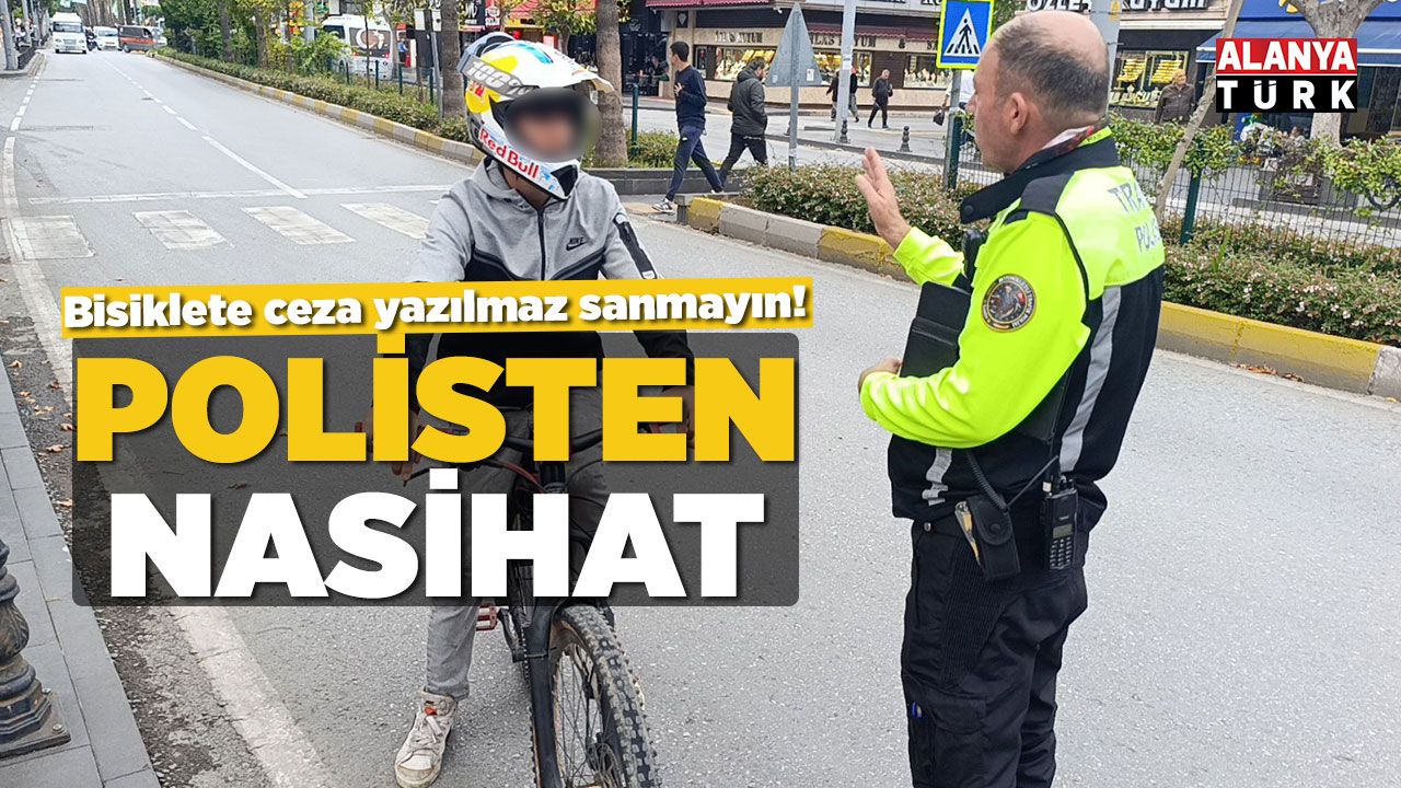 Antalya Caddesinde eski Kaymakamlık Konağı önünde uygulama yapan trafik görevlisi, durdurduğu bisiklet sürücüsüne nasihatte bulundu. Trafik polisi, bisiklet sürücüsüne "Yolun sağından gidiyorsunuz, yan yana değil arka arkaya kullanıyorsunuz. Burası bisikletin önünü kaldırma, akrobasi hareketleri yapma yeri değil. Bu hareketleri trafiğe kapalı yerlerde yapabilirsiniz. Bisikletin önünü kaldırırken düşersiniz, Allah korusun arkadan araç gelir altına alır. Bisiklete ceza yazılmaz diye düşünmeyin, bisiklete de ceza yazılır. KTK'nın 66. Maddesine bakarsanız ceza yazılacağını görürsünüz. Bu defa ceza yazmıyorum. Şimdi dikkatli bir şekilde en sağ şeritten akrobasi hareketi yapmadan yolunuza devam edin" dedi.