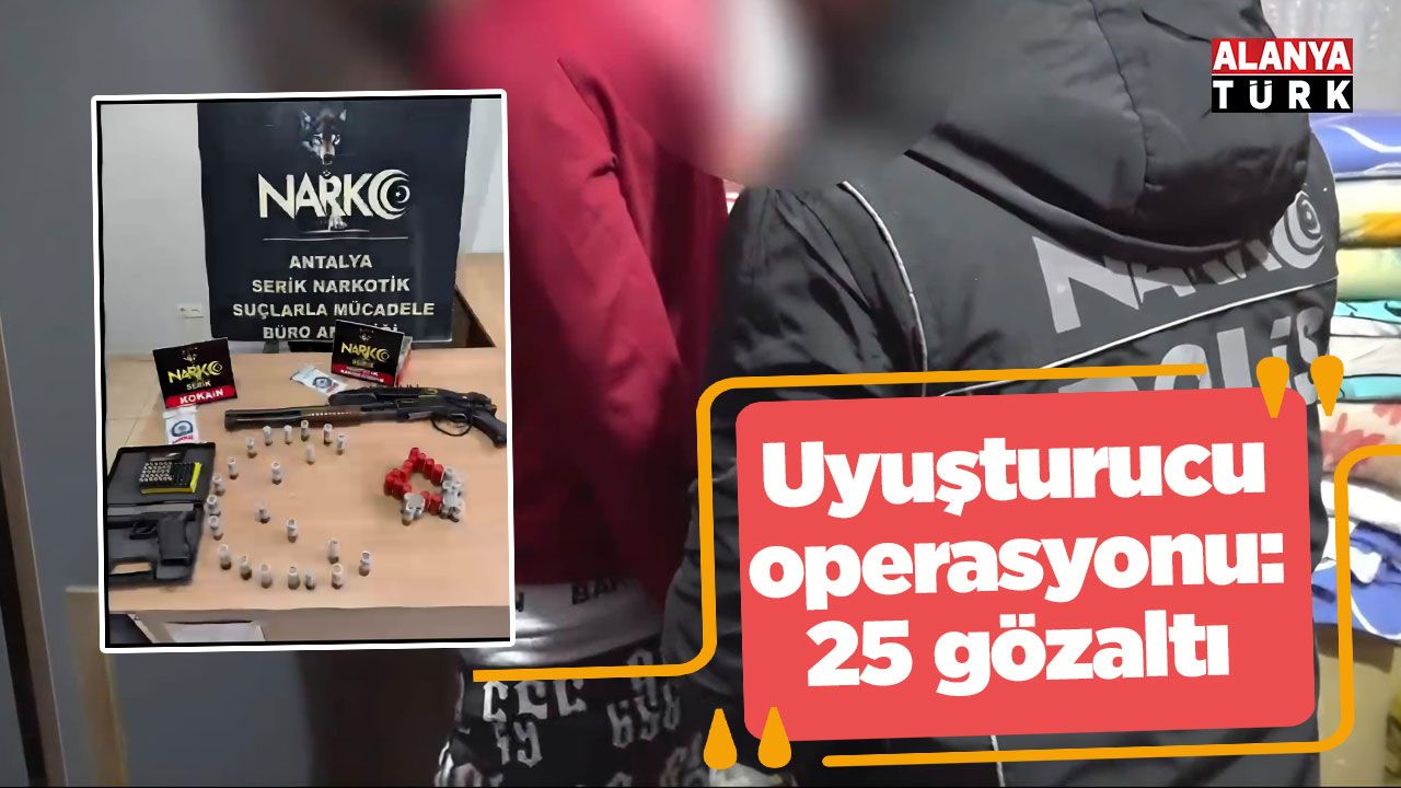 Serik Cumhuriyet Başsavcılığı talimatları doğrultusunda, Serik İlçe Emniyet Müdürlüğü ile Narkotik Suçlarla Mücadele Şube Müdürlüğü ekiplerince bugün saat 06.00’da eş zamanlı operasyon gerçekleştirildi. Operasyona toplam 152 personel katıldı. Uyuşturucu kullanımı başta olmak üzere suç ve suç unsurlarının tespiti ve yakalanmasına yönelik yapılan çalışmalarda, Serik ilçesinde belirlenen 32 adrese eş zamanlı baskın düzenlendi. Operasyon kapsamında 25 şüpheli yakalanırken, kullanıcı olduğu değerlendirilen şahıslardan kan ve idrar örnekleri alındı.