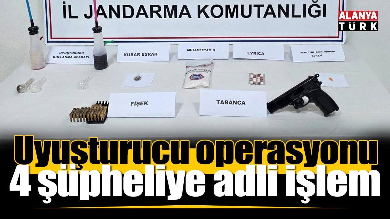 Antalya İl Jandarma Komutanlığı ekipleri, uyuşturucuyla mücadele kapsamında Döşemealtı ilçesinde operasyon gerçekleştirdi. Antalya Cumhuriyet Başsavcılığının talimatları doğrultusunda yürütülen çalışmalarda, 4 şüphelinin evlerinde, araçlarında ve üzerlerinde arama yapıldı. Aramalarda, 108 gram metamfetamin, 1 gram kubar esrar, 3 kullanımlık A4 sentetik kannabinoid madde, 12 adet sentetik hap (Lyrica), 5 adet uyuşturucu kullanma aparatı, 1 ruhsatsız tabanca ve 51 fişek ele geçirildi.