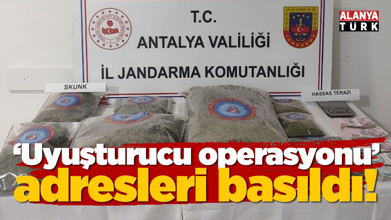 Antalya İl Jandarma Komutanlığı ekipleri, Konyaaltı ilçesinde yürütülen uyuşturucuyla mücadele çalışmaları kapsamında 10 şüphelinin adresine operasyon düzenledi. Cumhuriyet Başsavcılığının talimatıyla gerçekleştirilen aramalarda, 23 gram metamfetamin, 15 gram esrar, 34 adet sentetik uyuşturucu hap (Lyrica), 9 adet hap, 38 adet uyuşturucu kullanma aparatı (payp) ele geçirildi. Elmalı ilçesinde de 2 şüphelinin evinde ve aracında yapılan aramalarda 1 kilo 185 gram skunk, 1 adet hassas terazi ve suçtan elde edilen gelir ele geçirildi.