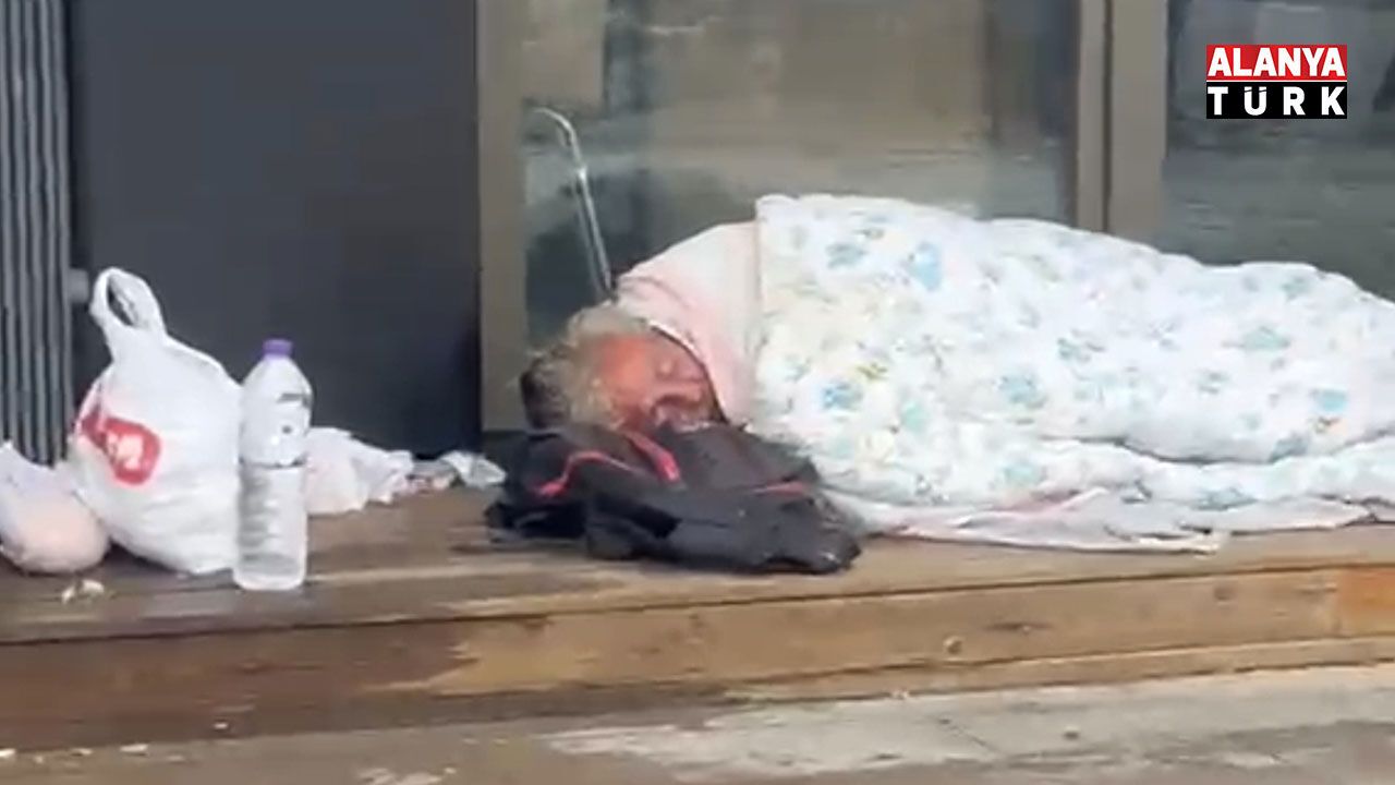 Alanya’nın en işlek noktalarından biri olan Hacet Meydanı’nda kaydedilen görüntüler, çevrede bulunan vatandaşların cep telefonu kameralarına yansıdı. Görüntülerde, evsiz olduğu tahmin edilen bir kişinin, meydanda inşası devam eden bir yapının kenarına sığındığı ve yağmur altında yorgana sarılı şekilde yerde yattığı anlar yer aldı.