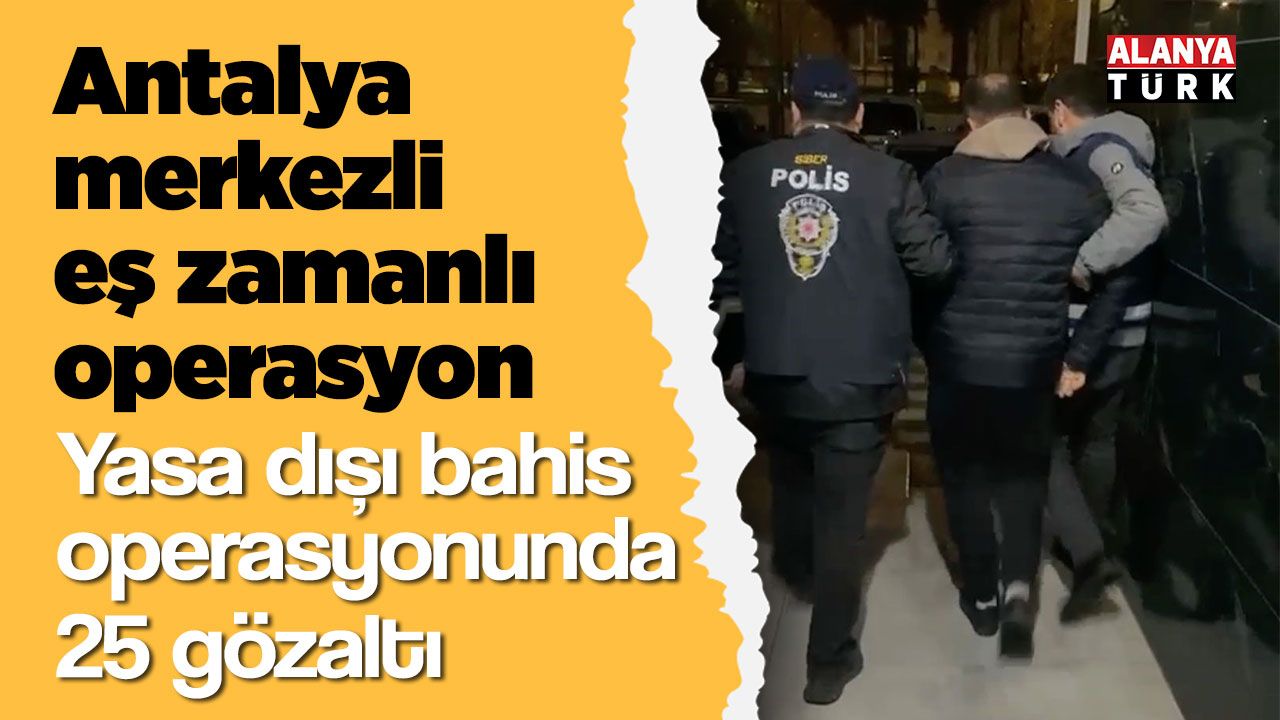 Mali Suçlar Araştırma Kurulu Başkanlığının (MASAK) analiz raporunda, yasa dışı bahis kapsamında haklarında istihbarat gelen ve para transfer işlemlerinin profili birbirine benzeyen şahısların bankalar nezdinde yer alan hesapları üzerinde çok yüklü miktarlarda para transferlerinin gerçekleşmiş olduğu bildirildi. Şahısların incelemesi yapılan hesaplarında 380 milyon TL işlem hacminin olduğu tespit edildi. Antalya Cumhuriyet başsavcılığı koordinesinde Antalya Emniyet Müdürlüğü Siber Suçlarla Mücadele Şube Müdürlüğü ekipleri tarafından yapılan Antalya merkezli eş zamanlı operasyonda 25 şüpheli gözaltına alınırken emniyetteki işlemlerinin devam ettiği bildirildi.